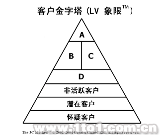 對于傳統(tǒng)的客戶金字塔而言,是以收入/單位客戶的產(chǎn)品數(shù)量需求/產(chǎn)生的硬件和軟件服務(wù)的各種組合為分割依據(jù)的,而這些分割也是有限度的?蛻糁艺\度和客戶價值的因素是不予考慮在內(nèi)的。