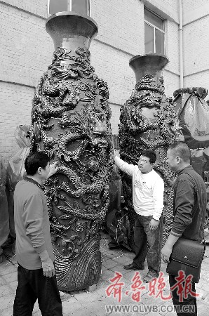 中國網(wǎng)·濱海高新訊 世界上最大的陶瓷龍瓶17日在淄博市淄川區(qū)燒造成功,該瓶高5米、最大直徑1.8米、重5噸,取名“江山永定”,由山東淄博辰浩陶瓷藝術研究設計院制作,采用傳統(tǒng)的制陶工藝,在窯爐內(nèi)雕塑而成。 劉振澤 閆盛霆 王恒 攝影報道
