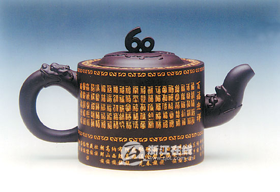 最讓程苗根自豪的是一把“仿古掇球壺”,壺高11厘米,最大直徑10厘米,在青黑的壺體上微刻了共有8360多字的整部陸羽茶經(jīng),并于1999年榮獲大世界基尼斯之最。