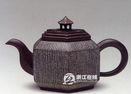 “喏,就是這套雙龍?zhí)崃簤,今年被評(píng)為‘中華民族藝術(shù)珍品’,其實(shí)早在2003年它就成為‘中國(guó)十大紫砂名壺’了。”