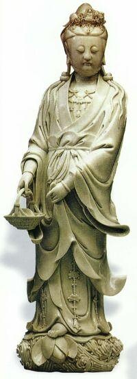 在故宮博物院收藏的德化窯瓷器中,有一件達摩立像聲望極高,屬明代晚期作品,出自明朝民間制瓷名家何朝宗之手。這尊瓷像高43厘米,光頭赤足,雙目圓睜下視,大耳鬢眉,鬢發(fā)均作卷曲狀,身披袈裟,雙手拱起于袖中,腳踩海水,如履云端,飄然若仙。人物脊背處刻有“何朝宗制”四字陰文印。通體施象牙白釉,滋潤柔滑。整個造型精湛優(yōu)美,身材魁梧,比例適度,制作精細。線條流暢,質(zhì)感極強。人物神態(tài)莊嚴肅穆,流露出一副超凡脫俗的形態(tài),個性鮮明而又不落俗套。作者在細部雕刻更是頗具匠心,把達摩外觀形韻、內(nèi)在氣質(zhì)與工藝技法有機地融于一體,達到了思想意蘊與藝術(shù)效果的高度和諧統(tǒng)一,可謂精心之作。
