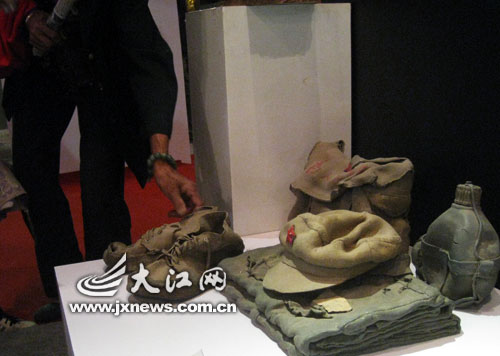 在一樓展廳中,2009景德鎮(zhèn)當代國際陶藝展展出的作品,顯示了中國、美國、愛爾蘭、韓國等各地藝術(shù)家的創(chuàng)意。這其中,最逼真的陶藝作品是來自中國陶藝家名為《昨天》的展示。布滿灰塵的紅軍帽、軍用水壺、背包,略顯破舊的膠鞋。幾乎每一個經(jīng)過這幅作品的參觀者都會邊用手摸摸,邊說:“呀,是真的用瓷器做的。”