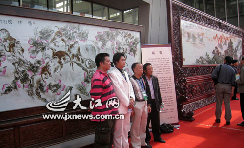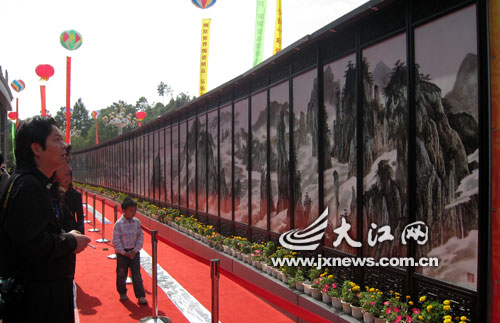 在展廳的入口處,作為新中國六十周年獻禮作品,幾幅瓷板畫是瓷博會上當之無愧的龐然大物。畫有靈猴、飛瀑、仙桃的《群猴集瑞圖》是目前世界上最大的粉彩瓷板畫,也是世界最大的以動物為題材的粉彩畫。它與陳列在旁邊的《馬到成功圖》共同分享2009瓷博會展出的最大單瓷板畫桂冠,同時這兩幅作品也列入吉尼斯紀錄。另一邊,全長42米的《西江攬勝圖》全景展現(xiàn)了江西的壯麗風貌,該作品已經(jīng)申報吉尼斯世界紀錄。