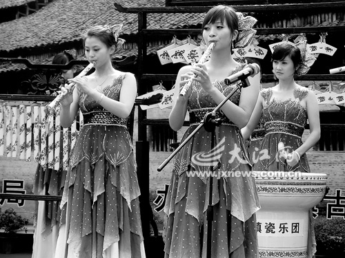 景德鎮(zhèn)瓷樂一枝獨(dú)秀,全市已成立4支瓷樂樂隊(duì)。圖為曾出訪過20多個國家和地區(qū)的景德鎮(zhèn)瓷樂團(tuán)在鎮(zhèn)窯復(fù)燃儀式上表演。本報(bào)記者智峰攝