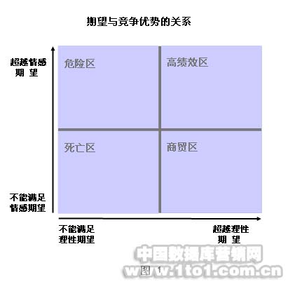 一般來(lái)說(shuō),橫渡公司在優(yōu)化理性元素上已做的不錯(cuò)。我敢說(shuō)大部分專業(yè)運(yùn)營(yíng)公司對(duì)客戶的理性期望已相當(dāng)了解,并已采取相應(yīng)措施取得了巨大的成果。但我也相信,這些公司幾乎不理解客戶的情感期望是什么。其實(shí)在競(jìng)爭(zhēng)優(yōu)勢(shì)(就忠誠(chéng)客戶及保持客戶長(zhǎng)期交易而言)和客戶期望之間有種獨(dú)特的關(guān)系。我用圖1的軸線圖來(lái)說(shuō)明3。圖中清楚地表明,沒(méi)有滿足感性和理性兩種期望的公司是在死亡區(qū),發(fā)展趨勢(shì)只有倒閉。多數(shù)大中型公司會(huì)在商貿(mào)區(qū)。通常,這類公司在理解客戶理性期望的基礎(chǔ)上采取優(yōu)化理性元素的措施,取得了卓有成效地成功。然而,他們?nèi)狈斫饪蛻羟楦衅谕姆椒,那么感性元素必然遭受忽視。在危險(xiǎn)區(qū)域中也很難發(fā)現(xiàn)健康的公司,無(wú)論是何原因,相比對(duì)待理性元素,它們看來(lái)更為重視感性元素。在極致的區(qū)域(左上角)內(nèi),似乎代表了欺騙性的藝術(shù)家。他們讓你癡迷,但在你找到時(shí)他們卻突然消失,除了空氣,你一無(wú)所獲。值得一提的是,我不是如此草率的建議一家公司要偏愛(ài)感性元素而忽視理性元素。我希望是一個(gè)保持平衡的方法?傊瑸榱诉_(dá)到高績(jī)效區(qū),公司要不遺余力地保持情感元素和理性元素的一致性和有意作為。