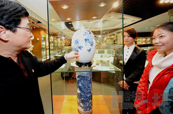 11月28日,景德鎮(zhèn)陶瓷藝術(shù)研究院陶瓷專家吳能(左)在北京王府井陶瓷城向參觀者介紹當(dāng)代陶瓷藝術(shù)作品!洞啥紓魅——2009當(dāng)代景德鎮(zhèn)陶瓷藝術(shù)作品展》11月28日在京展出。近千件現(xiàn)代陶瓷藝術(shù)精品匯集北京王府井陶瓷城,由中國(guó)工藝美術(shù)大師秦錫麟、王錫良、戴榮華、王恩懷為慶祝新中國(guó)成立60周年,聯(lián)袂設(shè)計(jì)、創(chuàng)作的紀(jì)念瓷《祖國(guó)頌》在本次展覽中展出,引起首都收藏界和陶瓷文化界人士的矚目。新華社記者張旭 攝