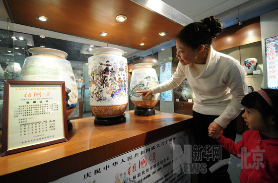 11月28日,觀眾在北京王府井陶瓷城參觀由四位中國(guó)工藝美術(shù)大師創(chuàng)作的紀(jì)念瓷《祖國(guó)頌》。 《瓷都傳人——2009當(dāng)代景德鎮(zhèn)陶瓷藝術(shù)作品展》11月28日在京展出。近千件現(xiàn)代陶瓷藝術(shù)精品匯集北京王府井陶瓷城,由中國(guó)工藝美術(shù)大師秦錫麟、王錫良、戴榮華、王恩懷為慶祝新中國(guó)成立60周年,聯(lián)袂設(shè)計(jì)、創(chuàng)作的紀(jì)念瓷《祖國(guó)頌》在本次展覽中展出,引起首都收藏界和陶瓷文化界人士的矚目。