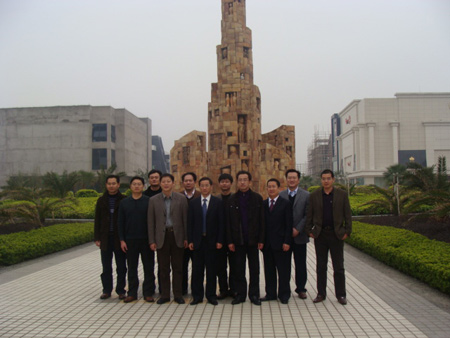 中國陶瓷城、中國陶瓷產(chǎn)業(yè)總部基地執(zhí)行董事周軍(前排左四)與當(dāng)陽市人民政府市委常委、副市長黃智華(前排左三)一行在陶瓷總部基地《中華之光》主題雕塑前留影