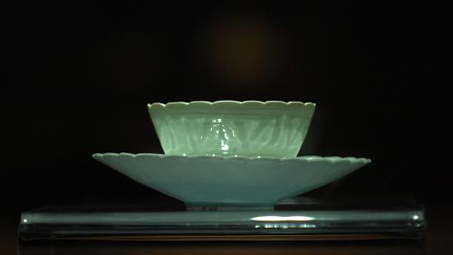 圖為展出的一件隨“南海一號(hào)”打撈出水、由國家博物館館藏的宋青白釉葉脈紋芒口碗及葉脈紋淺腹盤(10月2日攝)。