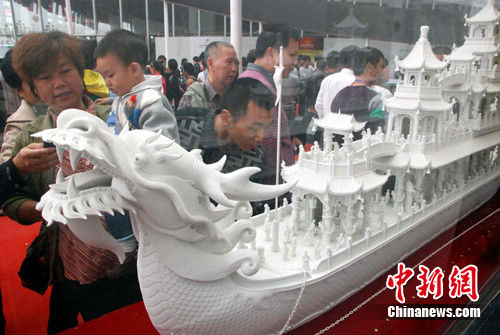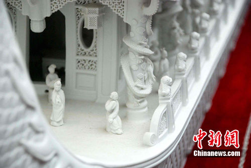 20日,一條仰首翹尾,活靈活現(xiàn)的瓷雕龍船現(xiàn)身“2010中國(guó)景德鎮(zhèn)國(guó)際陶瓷博覽會(huì)”,該龍船上微雕了152個(gè)《紅樓夢(mèng)》大觀(guān)園中的人物,堪稱(chēng)是一個(gè)龍船版的“大觀(guān)園”。
