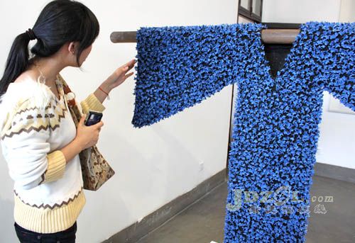 北京奧運(yùn)會上的青花禮服再現(xiàn)了青花瓷的暈染效果,魚尾裙的廓形設(shè)計凸顯中國女性的柔美曲線。青花圖案一度成為人們繪制服裝的必備元素,記者近日在景德鎮(zhèn)市樂天陶社見到,一件陶瓷漢服采用青花高貴的藍(lán)色,將麻布以陶瓷作點綴制成一件漢服,相當(dāng)驚艷。