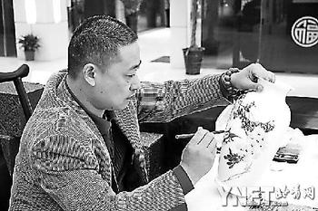 記者昨日從展覽現(xiàn)場看到,一位瓷器玩家在一位藝術(shù)家的作品前徘徊許久,提出要將這幾件作品全部買下,最后在主辦方要求下,這位玩家才同意展出結(jié)束后再提貨,讓更多的陶瓷愛好者能夠一飽眼福。(圖為景德鎮(zhèn)陶藝師現(xiàn)場彩繪)