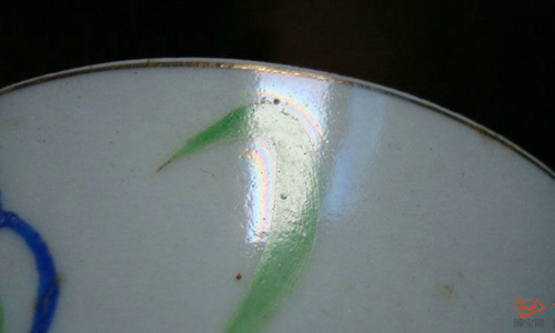 “蛤蜊光”,是指明清五彩、粉彩瓷器彩料周圍輪廓線在”白釉上“的一圈1~2mm的五彩光;或是沒(méi)有彩料,僅僅是在白釉上形成的不規(guī)則圓形五彩光。其主要形成原因是因?yàn)椴柿侠锖?ldquo;鉛”,經(jīng)過(guò)近百年的時(shí)光,鉛被氧化所造成。蛤蜊光一般在明末(指天啟往后,嘉、萬(wàn)五彩基本不見(jiàn))、順治五彩,老康五彩、斗彩,雍正斗彩、粉彩(官窯的比民窯多見(jiàn))和乾隆的粉彩等等上都可看到。晚清的五彩、粉彩上也看看到,但出現(xiàn)頻率不如三代。民國(guó)一些日用粉彩瓷器上亦十分常見(jiàn)。