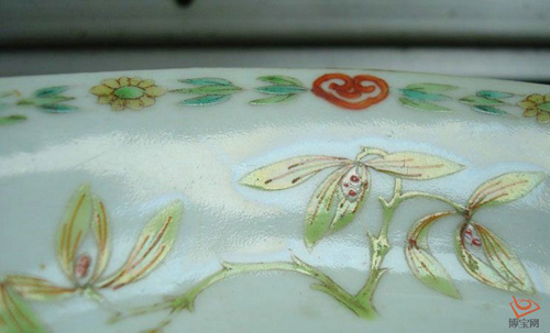 “光暈”,在許多陶瓷著作上指的是由于年代久遠(yuǎn),彩料“本身上”產(chǎn)生的一層彩光,不是在白釉上的。這類現(xiàn)象主要產(chǎn)生在明代五彩上(以“棗皮紅”為明顯)和清代、民國(guó)的五彩、斗彩和粉彩上。