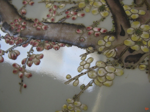 “光暈”,不是鑒定真?zhèn)蔚囊罁?jù)。據(jù)筆者所知,現(xiàn)代景德鎮(zhèn)所燒粉彩瓷器都有光暈。是因?yàn)闊鞙囟鹊年P(guān)系。但若能細(xì)心比較、甄別和體會(huì),能對(duì)老的光暈和新的光暈的物理表現(xiàn)有所區(qū)別的話,它亦不失為鑒定彩瓷真假的好依據(jù),尤其是明代五彩。