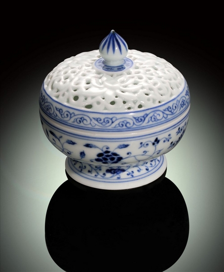 《青花纏枝蓮紋雕刻香薰?fàn)t》