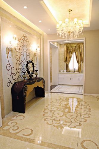 裝修上我們用的是也是高標(biāo)準(zhǔn),用磚上我們用到了很多深加工的工藝,像大廳地面大型的拼花;墻面上的倒角、雕刻裝飾;門套上的立體鋪貼;鎦空的背景墻等都是很精致的。另外我們也用到了很多瓷磚和其它材質(zhì)配合的嘗試,比如茶鏡、金屬、木線、壁紙、皮毛的搭配裝飾,在細(xì)節(jié)上做得既金碧輝煌的華麗而不會空洞俗氣。你可以看到我們用的家具、燈飾也是配合得很好的,整體就是一個現(xiàn)代歐式的別墅。