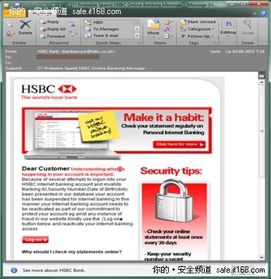 釣魚(yú)郵件中包括假冒銀行、電子支付系統(tǒng)、電子郵件服務(wù)提供商、社交網(wǎng)站以及在線游戲等機(jī)構(gòu)發(fā)送的虛假信息。這些郵件的目的是為了獲取用戶的機(jī)密數(shù)據(jù)(如用戶名和密碼等)。其中,冒充銀行進(jìn)行網(wǎng)絡(luò)釣魚(yú)詐騙的現(xiàn)象最為普遍,其目的是獲取和控制用戶的在線銀行賬戶或電子支付系統(tǒng)賬戶。一旦網(wǎng)絡(luò)罪犯掌握了用戶的登錄名和密碼,就可以直接訪問(wèn)用戶賬號(hào)。
