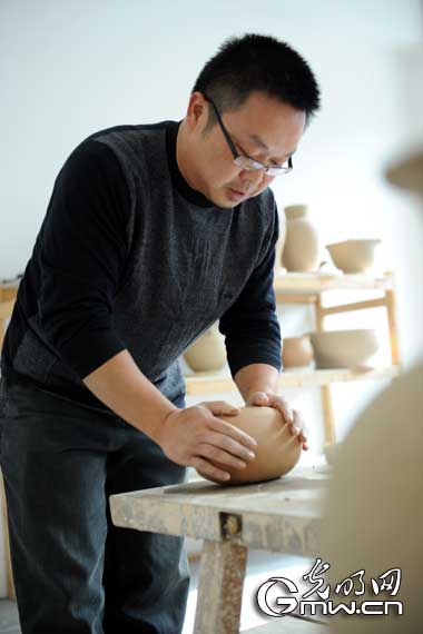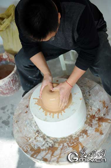 圖為龍泉青瓷燒制大師張晞現(xiàn)場(chǎng)展示制作青瓷的工序——成型。記者 楊慧峰攝
