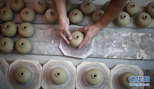 在鶯歌鎮(zhèn)的一個(gè)陶藝工作室里,制陶師傅蔡青峰在整理已經(jīng)干燥的陶坯。