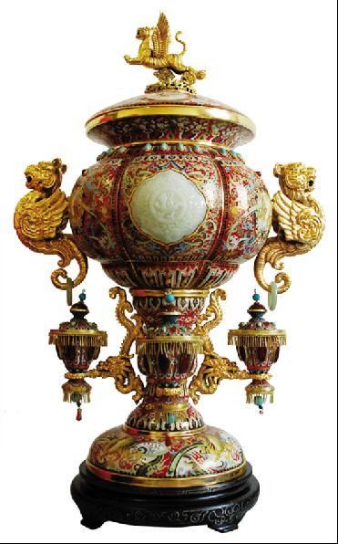 在目前的景泰藍(lán)藝術(shù)界,有專家評(píng)價(jià)能與清代景泰藍(lán)天價(jià)逐鹿的當(dāng)代大師,唯張同祿一人。張同祿的作品從不停留在一花一鳥的加減上,他把牙雕、翡翠、和田玉、珊瑚、瑪瑙、綠松石與景泰藍(lán)兼容并蓄,充滿珠光寶氣,富麗堂皇;他熟練駕馭各種技法,將鏨刻、花絲、鑲嵌、燒瓷、打銅融會(huì)貫通,作品處處彰顯形式美法則,造型莊重而不失俏麗;色彩對(duì)比而不失和諧。甚至有行家認(rèn)為,張同祿的作品二三十年后也難有人逾越。