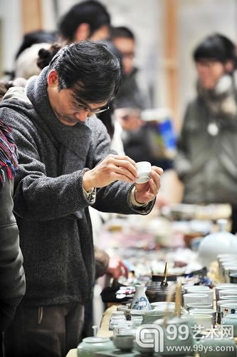 參觀者在展賣會上挑選陶瓷工藝品
