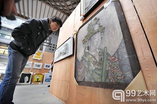 參觀者在展賣會上欣賞繪畫作品