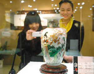 觀眾正在欣賞當(dāng)代“古彩大王”、中國(guó)工藝美術(shù)大師戴榮華的《人面桃花相映紅》古彩瓷瓶!