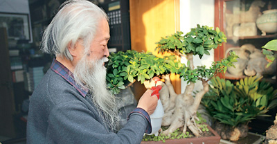 陽光透過窗戶照落進(jìn)來,灑在窗臺旁的盆景上,樟樹散發(fā)出淡淡的清香,榕樹也泛著墨綠色的光芒。王老指著這些陪伴自己的盆景笑著說:“盆景也是中國文化的一部分。”