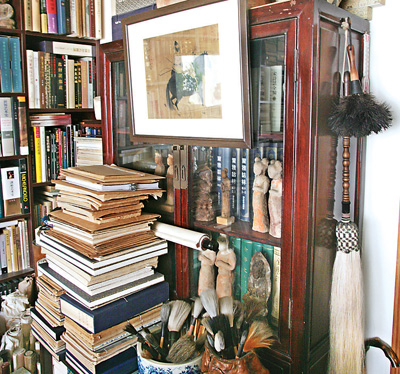 走進(jìn)小小的書房,就被各種書籍吸引,還有他親自修補(bǔ)裝裱的碑帖,再加上“見縫插針”的各種古陶瓷,在屋里轉(zhuǎn)身都有些困難。