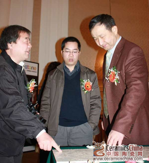 (中國建筑衛(wèi)生陶瓷協(xié)會(huì)會(huì)長(zhǎng)葉向陽(右)在廣東金牌陶瓷有限公司生產(chǎn)總經(jīng)理梁志啟(中)的陪同下鑒賞新品.)