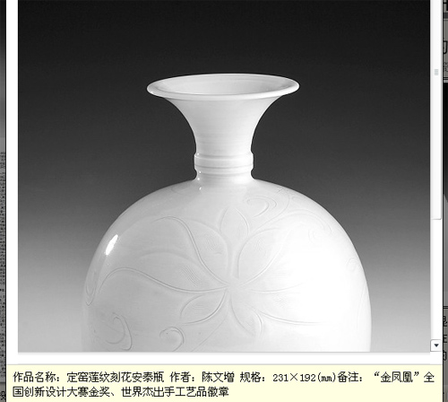 陳文增從事定窯研究30余年,為恢復(fù)、傳承定窯這一中華民族瑰寶殫精竭慮,歷盡艱難,終于使失傳千年之久的歷史名窯再現(xiàn)人間。他總結(jié)出定窯特有的“形、聲、色”風(fēng)格特點,確立了科學(xué)的定窯泥料制備方法及傳統(tǒng)拉坯工藝操作規(guī)程和技術(shù)要求,制定了科學(xué)的燒成曲線和規(guī)范的燒成制度,發(fā)明了定瓷刻花專用刀具——— 單線刀、雙線刀、組線刀,打破了陶瓷史上關(guān)于定瓷雙線紋樣“刻一刀,復(fù)一刀”的說法,并形成“刀行形外,以線托形”的經(jīng)典刻花理論,被香港《大公報》譽(yù)為“比宋時有過之而無不及”;制定了定窯“古、新、奇”發(fā)展戰(zhàn)略,形成藝術(shù)、仿古、日用、名人作品四大系列、百余品種的定瓷生產(chǎn)規(guī)模;成功申請“定瓷傳統(tǒng)燒制技藝”入選國家級非物質(zhì)文化遺產(chǎn)名錄;自創(chuàng)“瓷、詩、書三聯(lián)藝術(shù)”入選大世界基尼斯之最;以“光中華之絕技,創(chuàng)定窯之全新”為歷史使命,建立了定瓷生產(chǎn)性保護(hù)機(jī)制、大師授徒傳承機(jī)制和文化型大師創(chuàng)作隊伍的人才培養(yǎng)模式,為定瓷的傳承保護(hù)打下了堅實的人文基礎(chǔ)。