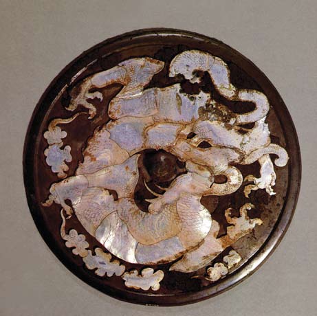 唐代銅鏡,鏡背褐色漆地上以螺鈿鑲嵌一龍