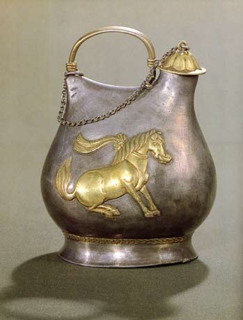 唐代舞馬銜杯紋銀壺,陜西省博物館藏。