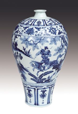 下圖為2005年7月12日在倫敦佳士得進(jìn)行的“中國(guó)瓷器及藝術(shù)品”拍賣(mài)中,以1568.8萬(wàn)英鎊的價(jià)格成交,折合人民幣2.3億多元,拍出了目前中國(guó)瓷器最高價(jià)格的元青花“鬼谷子下山”圖罐。此罐主題畫(huà)面描述了孫子之師鬼谷子(號(hào)王詡)下山搭救齊國(guó)名將孫臏與獨(dú)孤陣。鬼谷乘坐一虎一豹的車(chē),