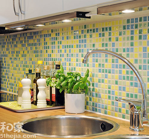 來(lái)看看墻面使用的馬賽克瓷磚,藍(lán)綠黃三色拼湊出一份清新感;墻面的鋪貼采用的是陶瓷馬賽克,也與有些廚房會(huì)采用的玻璃馬賽克不同哦;雖然缺少了玻璃馬賽克的一份剔透,但反而對(duì)于冬季來(lái)說(shuō)就不顯得太過(guò)寒冷。