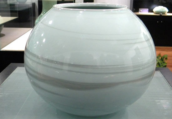 從此次參展的作品來看,參展作品《天池》采用雙層拉坯法,倒置拉坯成型,器型飽滿厚重,內(nèi)青外白,特殊刀法刻畫出的流動(dòng)性線條使作品產(chǎn)生旋轉(zhuǎn)中的率動(dòng)性,一弘清泉,浩月在天,動(dòng)與靜的巧妙結(jié)合,使作品具有強(qiáng)烈的視覺效果和藝術(shù)感染力。《云水》簡(jiǎn)練飽滿,流動(dòng)性的絞胎紋線條粗細(xì)相間,宛如行云流水,構(gòu)成了一幅江南山水畫,作品詩(shī)一般的意境和獨(dú)特的田園風(fēng)情,讓人產(chǎn)生無限遐想。美輪美奐,比較全面的展示了盧大師近年青瓷藝術(shù)的巨大成就。