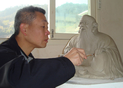 林建全的藝術(shù)造詣當(dāng)然不能跟那些風(fēng)流絕代的宗師們相提并論,但是他對(duì)瓷塑藝術(shù)的癡狂勁,卻跟他們?nèi)绯鲆晦H。見(jiàn)到其人,你能強(qiáng)烈感受到他的這種真情。說(shuō)他癡,一談起瓷塑他就興奮得像個(gè)孩子,說(shuō)自己每投入創(chuàng)作,一做就是十幾個(gè)小時(shí),精神總是處在“瘋狂狀態(tài)”中;說(shuō)他狂,他知人論世,不僅眼光獨(dú)到,敏思有識(shí),而且快人快語(yǔ),干脆利落。他的“癡”和“狂”,說(shuō)到底還是源于性情的“真”,源于他對(duì)瓷塑藝術(shù)真摯的深情。他于1960年生在德化,從小耳濡目染于瑩潔溫潤(rùn)的德化白瓷世界,浸潤(rùn)于何朝宗等著名匠師的瓷塑技藝之中,與德化瓷塑藝術(shù)天生有著不解之緣。他說(shuō)自己幾十載創(chuàng)作瓷塑,苦心孤詣,甘于寂寞,每件作品從構(gòu)思、起稿、完善到最后完成,經(jīng)歷這樣的過(guò)程本身就是一種享受,比干什么都好。