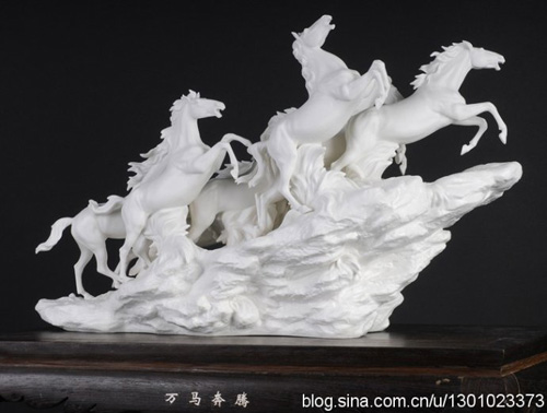 20多年來(lái), “瓷塑狂人”林建全共做過(guò)多少瓷塑?沒(méi)有誰(shuí)算過(guò),恐怕連他自己也說(shuō)不清。他的工作室不是一間,不是一層樓,而是一棟四層樓,每層都有許多間;他的作品不是一件一件出爐,而是一批接一批,一個(gè)系列一個(gè)系列地涌出!而無(wú)論是成批還是成系列,都是一件一件靠自己手工做出來(lái)的,而非復(fù)制成型。比如,他做的《世界近200幅名人肖像浮雕》系列,光聽(tīng)這名稱就讓人瞠目!200位名人,200張不同面孔,都是人們熟知的,怎么可能復(fù)制?還有《十大元帥浮雕》系列、《偉人毛澤東》系列、《開(kāi)心彌勒佛》系列等等,每個(gè)系列一做就是十件、幾十件、上百件!這不但需要精準(zhǔn)的造型功力,需要掌握各種復(fù)雜的工藝技術(shù),還要速度!他的“癡”和“狂” 也體現(xiàn)在這成批成系列產(chǎn)出的速度上。又如,被稱為“馬癡”的他給我們打開(kāi)了一個(gè)專門(mén)存放瓷塑馬的陳列室,映入眼簾的,是幾十種神態(tài)飛揚(yáng)的“白瓷馬”,每一匹(或每一組)的造型動(dòng)態(tài)都各不相同!這顯然不是同一模件能夠復(fù)制出來(lái)的!