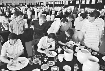 昨日,在武漢國際會展中心廣場“當代名家陶瓷鑒賞會”上,景德鎮(zhèn)陶瓷書畫藝術大師們現(xiàn)場詮釋了當代瓷器創(chuàng)作工藝、制作流程以及瓷器紋飾鑒定等,吸引了眾多參觀者。此次舉辦的“首屆中華風名優(yōu)陶瓷工藝品現(xiàn)場繪畫作品展”將持續(xù)到12日。記者 邱焰 攝