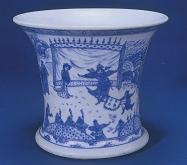 康熙青花使用的是極為純凈的云南珠明料,呈純藍(lán)色,濃淡層次多而分明,故稱“康熙五彩”,此器就具有這一典型特點。高13.5cm,直口,筒腹,玉璧底。腹部主題紋飾為元代戲劇故事圖,配以詩文。其繪畫特點受中國畫的影響,采用層層涂染的技巧,所繪人物用披麻皴法,線條纖細(xì)有力,生動自然。青花色調(diào)鮮麗,層次多而清晰,充分反映了這一時期青花的典型特征。