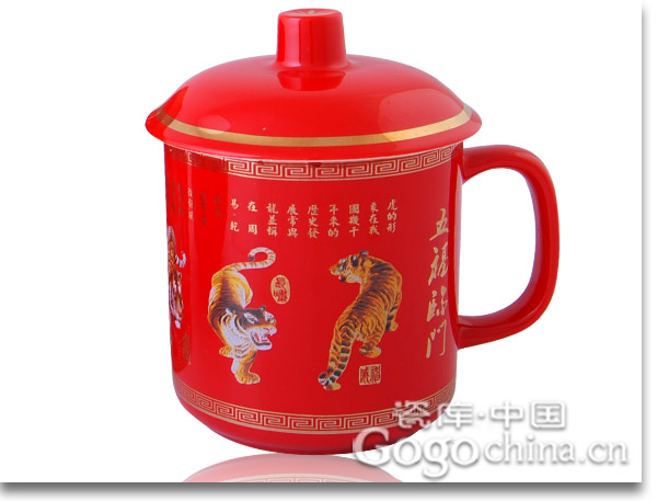 圖:中國(guó)紅瓷描金吉祥虎辦公三件套
