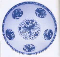此碗口徑16cm,形體規(guī)整,外壁繪雙鳳飛舞圍繞腹際,間以如意云紋“萬”字錦地紋,碗內(nèi)繪團(tuán)鳳紋,畫面布局清秀、簡練、明快。青花顏色濃郁深沉。