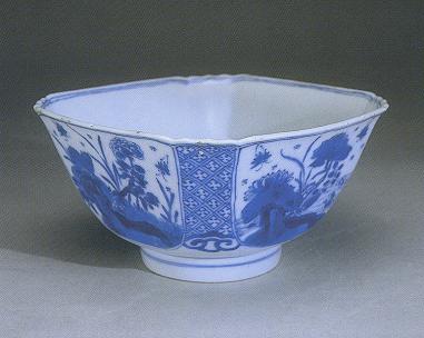 該方碗口徑為14.8*14.4cm,侈口,方棱形口沿,腹呈方形,固足。腹部四面繪有表示祝福與象征吉祥的梅樹、菊花、牡丹、荷花,襯以山石花草,四棱角處配飾幾何錦地紋,下為如意云頭紋,器內(nèi)底方框內(nèi)繪蘭草花卉。繪畫工整,題材豐富,畫意深遠(yuǎn)。青花色調(diào)淺淡,造型獨(dú)特,是康熙中期民窯青花的典型代表。