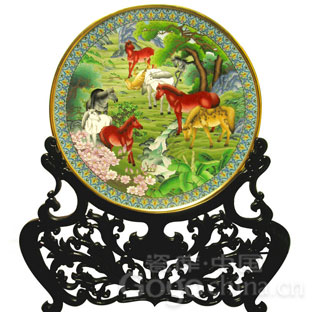 景泰藍(lán)30寸群馬盤-藝術(shù)瓷盤直徑76厘米,圖案由群馬構(gòu)成,瓷盤整體造型宏偉典雅,構(gòu)圖和諧,安逸的氣氛下孕育著自然而又渾厚的爆發(fā)力。剛健有力的線條生動(dòng)的刻畫(huà)出千里駒的悠閑活潑,整個(gè)作品酣暢淋漓,讓觀者瞬間與作品產(chǎn)生共鳴。寓意昌盛發(fā)達(dá)、馬到成功、運(yùn)氣時(shí)來(lái)運(yùn)轉(zhuǎn)之意。
