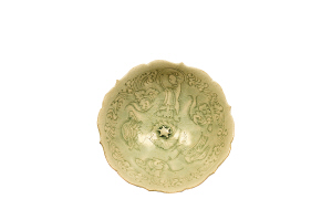 1998年6月,瓊海漁民在西沙華光礁捕魚(yú)作業(yè)時(shí),采挖出北宋瓷器和錢幣。其中,最具傳奇色彩的就是做工精美,釉色呈天青色的龜鶴仙人紋碗和盤。碗葵花形口沿,胎體薄而透光,釉水天青色,碗心有一凸起小龜,碗內(nèi)壁刻劃仙人、仙鶴、龜、祥云?袒ㄐ性屏魉,刀法嫻熟,各個(gè)造型惟妙惟肖,出神入化。仙人飄逸灑脫,仙風(fēng)道骨,欹側(cè)揖讓觸處成妙。仙鶴曲頸而棲,恬適靜美。龜則騰云駕霧,遒勁而走。龜盤刻劃內(nèi)容亦然,不同之處為淺腹,淺圈足。碗和盤底均無(wú)釉?坍(huà)之灑脫浪漫,可以想象古人了然于胸,飛刀走石之間,天馬行空,飛逸奇恣,一氣呵成的優(yōu)雅一瞬。