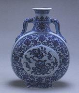 乾隆時期的青花瓷器以形制多樣而取勝,此壺為清代乾隆官窯青花瓷器的代表作品。壺高24.3cm,長頸,小口,體呈扁圓形,圈足,頸與肩部有一對如意形耳。腹前后為杏圓形開光,內(nèi)繪桃和蝙蝠,腹部周圍飾以蓮花圖案。這件扁壺屬陳設(shè)品,造型與紋飾相結(jié)合,寓有“福壽”之意,底有“大清乾隆年制”款。