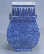 穿帶瓶是清代較流行的瓷器樣式,方形,貫耳,白地青花。該瓶高25.2cm,口徑11cm,器身滿飾海水紋,在波浪滔滔的海水中,葫蘆、扇子、長笛、寶劍、玉板、荷花、花籃、魚鼓漂流起伏,借物喻人,描寫八仙過海的傳說。瓷器釉面光潤明亮,形體豐滿端正。