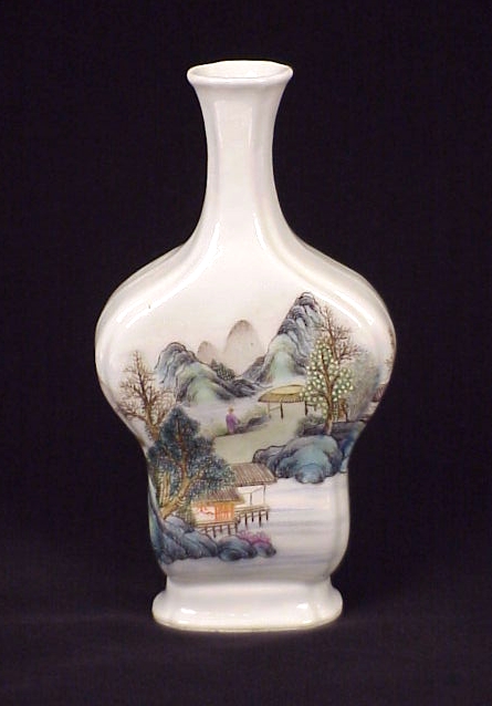 所謂洪憲瓷,即落有“洪憲年制”或“洪憲御制”款識的瓷器。北京藝術(shù)博物館收藏有數(shù)件此類款識的瓷器,如一件粉彩人物紋瓶,口徑10.1厘米,底徑10.3厘米,高27.7厘米,腹圍50厘米。造型為撇口,短頸,溜肩,長圓腹,圈足。口沿描金,口內(nèi)施松石綠釉。器身通景繪粉彩山水人物紋,題名為“淵明愛菊”。底亦施松石綠釉,書紅彩“洪憲年制”四字楷體雙方框款,款識工整。