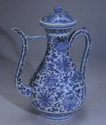 此壺是由玉壺春瓶演變而來的,故又稱“玉壺春壺”。通高31cm,侈口,細(xì)頸,溜肩,垂腹,圈足外撇,頸至腹間設(shè)長流和曲把,形狀秀美穩(wěn)重。腹部主題紋飾為纏枝蓮?fù)邪藢殻、下以蓮瓣紋為陪襯,流飾折枝花卉,柄是卷草紋。青花色調(diào)藍(lán)中閃灰,呈色穩(wěn)定,具有乾隆朝的風(fēng)格。繪畫筆法纖細(xì)拘謹(jǐn),畫面顯得呆板,是嘉慶時的特征。